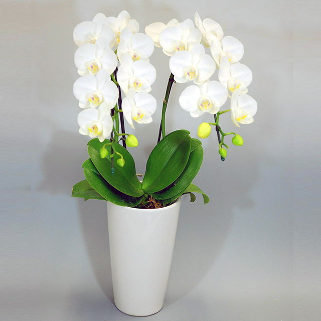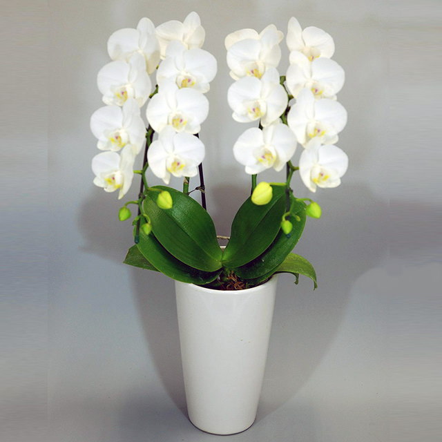 純白のミディ胡蝶蘭 アマビリス。定番の白色であるため、贈答品として大変人気が有ります。予算的にも大変お求めやすく、とても人気の有る白色の胡蝶蘭です。メッセージカード、リボンご希望の場合は注文フォームにて記載欄にご記入下さい。無料にてサービスさせて頂きます。