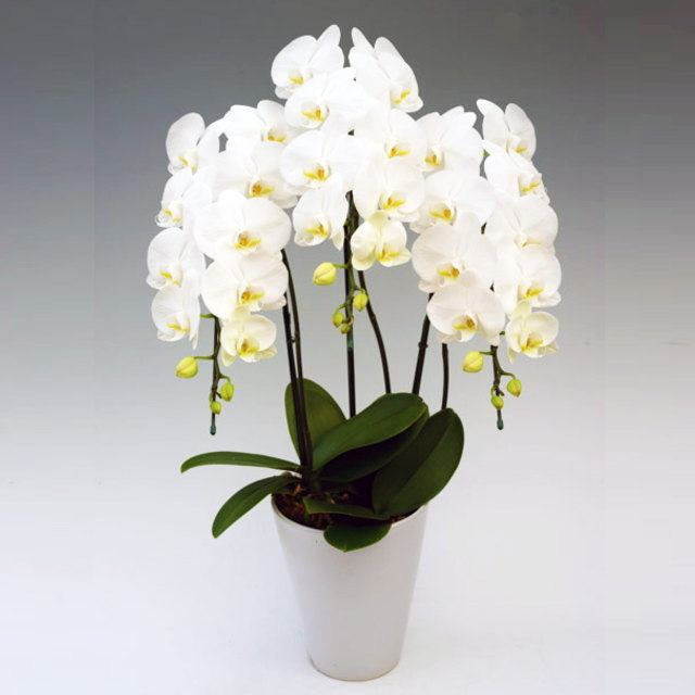 胡蝶蘭は花の大きさにより大輪、中大輪、ミディ、ミニと4タイプに分類されています。ダイヤモンドスターの花サイズは11~14cm程で大輪系胡蝶蘭よりは一回り小ぶりですが、ボリューム感がとても有ります。ダイヤモンドスターは花びらがまっすぐ並んでいるのが特徴で、花がダイヤモンドのように白く輝いている為、予算的にもお求めやすく、とても人気の有る白系の胡蝶蘭です。ラッピングをしてお届け致します。メッセージカード、立札ご希望の場合は注文フォームにて記載欄にご記入下さい。無料にてサービスさせて頂きます。