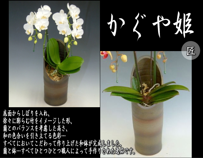 有名窯元による手作りの竹をイメージした和鉢に純白ののミディ胡蝶蘭「アマビリス」を組合せました。底面からしぼりをいれ、徐々に膨らむ竹をイメージした形、胡蝶蘭とのバランスを考慮した高さ、和の色合いを引き立てる色彩。すべてにおいてこだわって作り上げた和鉢が完成しました。三河の窯元「豊繁」(とよしげ)一年がかりで試作を繰り返し完成したこだわりの和鉢です。