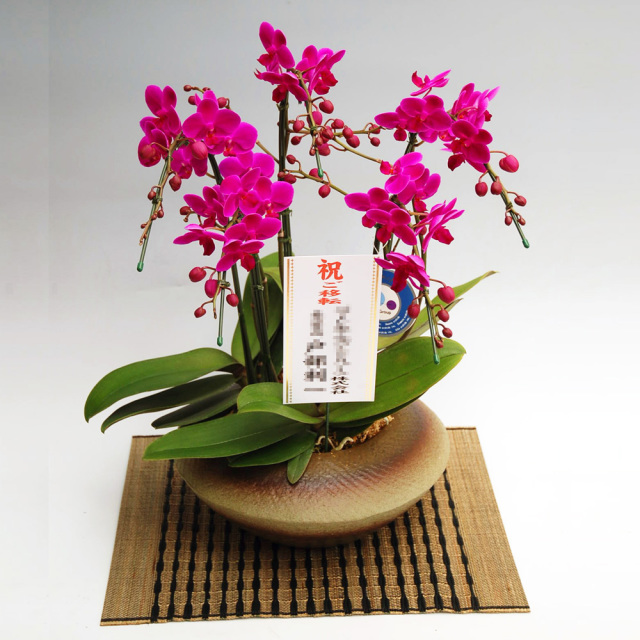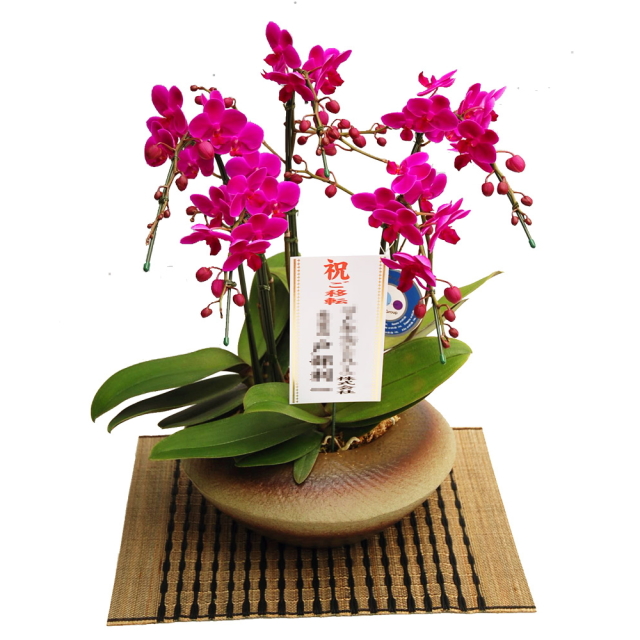 品評会で数々の賞を受賞している胡蝶蘭です。とても花持ちが良く、ビロードのような濃いピンク色をした胡蝶蘭です。予算的にもお求めやすく、とても人気の有る紅色の胡蝶蘭です。この和鉢「まどか」は、従来の鉢の常識にとらわれない、その独特の形状で、ただそこに置くだけで上質な和の空間を演出することができます。窯元は三河の窯元「豊繁」(とよしげ)の作品です。すべて職人による手作りでひとつひとつ心をこめて仕上げた一品です。開店記念、周年記念、誕生日、記念日など大切な場面でご利用頂いています。